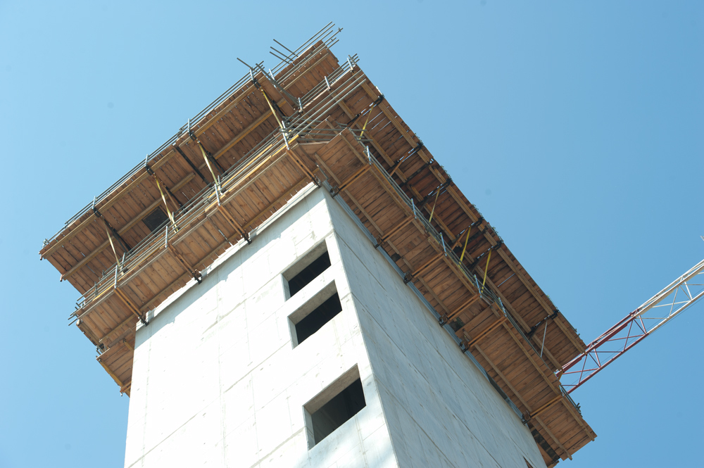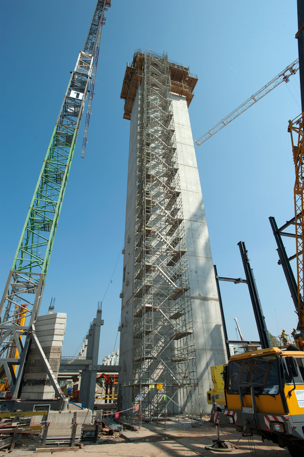 Kluczowa dla harmonogramu prac na wszystkich obiektach była budowa pylonu o wysokości 64 m. Jego konstrukcję żelbetową zrealizowano w 12 tygodniowych taktach przy zastosowaniu konsol przestawnych BMK, zintegrowanych z deskowaniem PRIMO od zewnątrz. Wewnątrz klatki schodowej zastosowano przestawne platformy robocze KSP. Do obsługi zbrojenia oraz do zapewnienia komunikacji pionowej (schodnia o wysokości 64 m) wykorzystano rusztowanie BRIO. W trakcie realizacji głównej klatki schodowej wbudowano 800 m3 betonu.