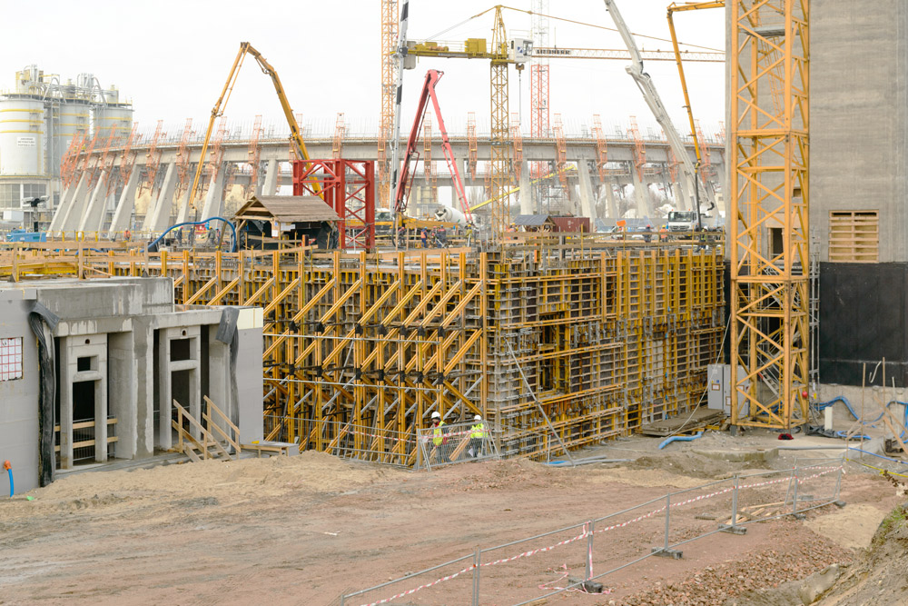 Fundament kotła ma w planie wymiary 87,1 m x 63,35 m oraz wysokość od 3,0 do 6,6 m, co wymagało ułożenia w jednym takcie ponad 20 tys. m3 mieszanki betonowej. Betonowanie trwało przez 6 dób. Do realizacji fundamentu zastosowano deskowanie ramowe PRIMO oraz kozły oporowe SMK. W płycie fundamentu zaprojektowano kanały kablowe o wysokości 3,3 m, do wykonania których ULMA zaprojektowała i dostarczyła specjalne podkonstrukcje tracone.