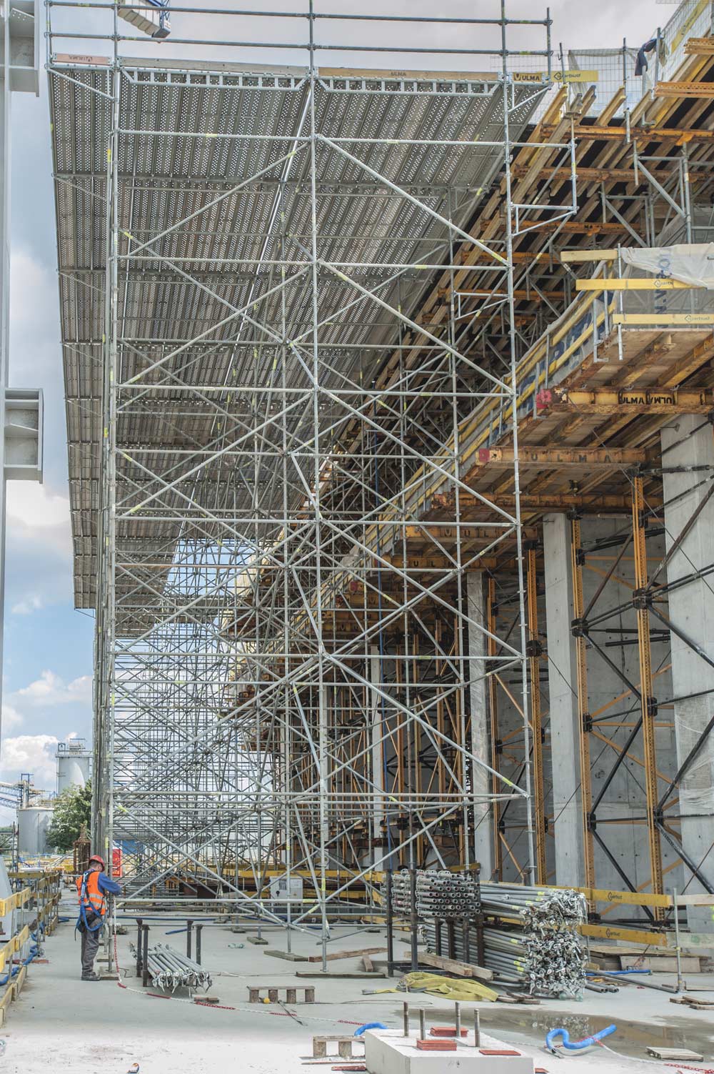 Zgodnie z oczekiwaniami klienta ULMA dostarczyła pełen zakres zabezpieczeń dla zastosowanych rozwiązań. Deskowania ścienne wyposażono w podesty robocze zarówno od strony otwarcia, jak i zamknięcia. Na budowie zastosowano zarówno standardowe rozwiązanie ULMA bazujące na gotowych podestach stalowych, montowanych na wspornikach podestów, jak również nowy system podestów roboczych SBU. Jego budowa opiera się na systemowych wspornikach, które umożliwiają wykonywanie podestów roboczych z elementów certyfikowanego rusztowania BRIO. Konstrukcja systemu BRIO pozwala m.in. na pełne zamknięcie pionu z komunikacją, co zwiększa poczucie bezpieczeństwa przemieszczającego się pracownika.