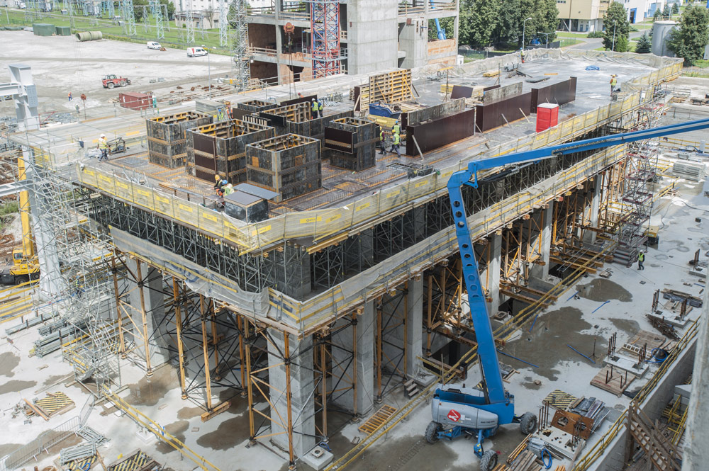 Typowe stropy budynku wykonano przy użyciu stolików VR oraz deskowania dźwigarkowego ENKOFLEX. Stoliki VR na podporach ALUPROP znalazły zastosowanie podczas realizacji belek żelbetowych. Konstrukcję deskowania oparto na ryglach MK, co umożliwiło wykonanie składanych na zawiasie części zewnętrznych elementu. Zmiana geometrii stolików pozwoliła na prostszy i szybszy transport deskowania pomiędzy stropami. Stropy wyższych kondygnacji o wysokości sięgającej 9,5 m zrealizowano przy użyciu wież podporowych T-60, poszytych rusztem z belek drewnianych VM.
