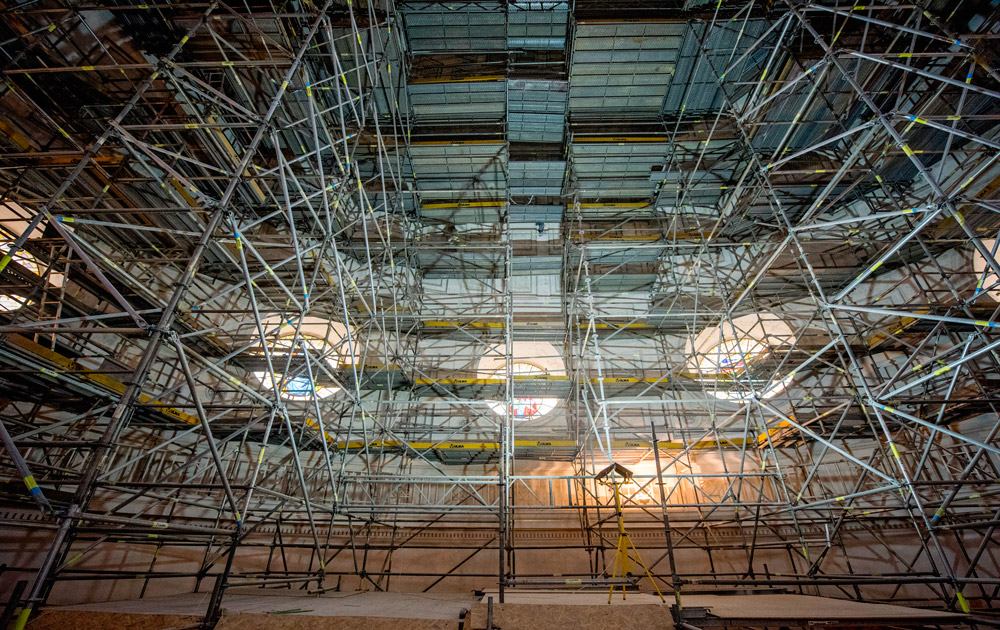 Kolejne wyzwanie stanowiło wykonanie podwieszanej platformy rusztowaniowej (w kształcie ośmiokąta w rzucie) w przestrzeni głównego świetlika kopuły, na wysokości 8 m. W projekcie podwieszenia rusztowania wykorzystano kratownice BRIO, wspierające się na wieńcach żelbetowych podstawy latarni.