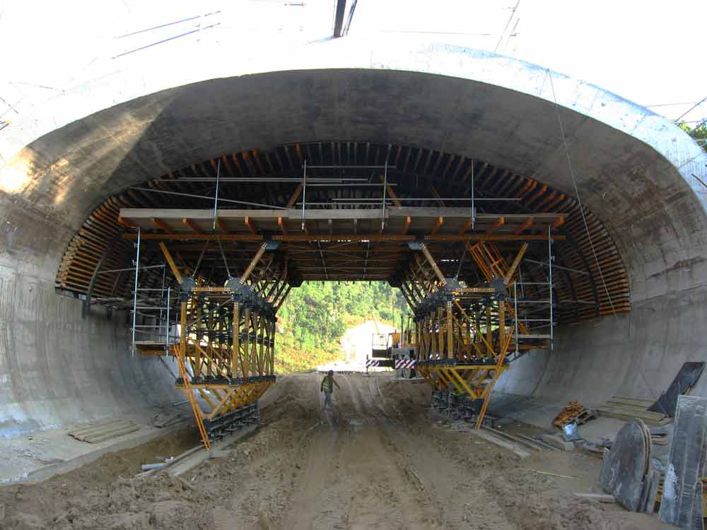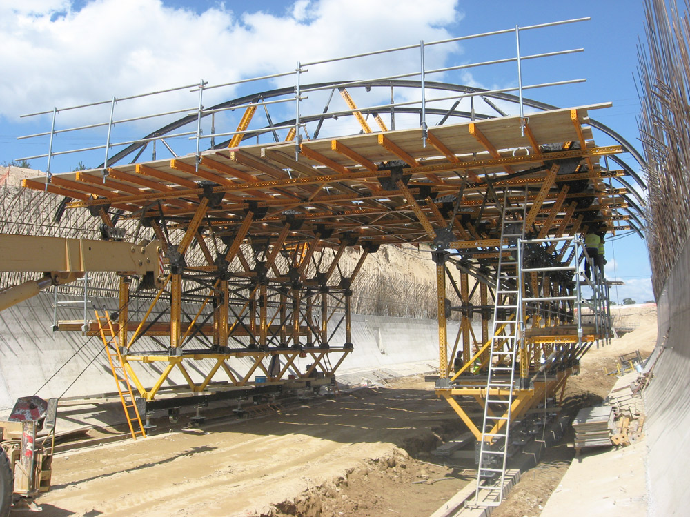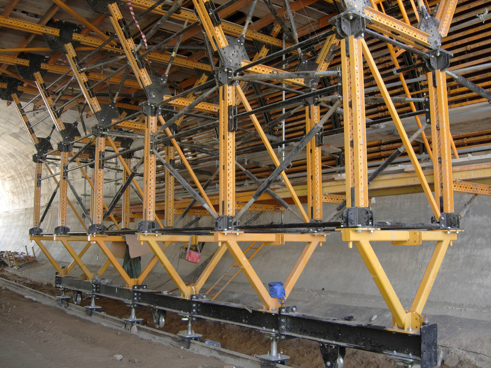 Wewnętrzne deskowanie sklepienia tunelu zamontowano na wózku przejezdnym ustawionym na szynach. Wózek wykonany ze stężeń MK wyposażono w podesty robocze na różnych poziomach.