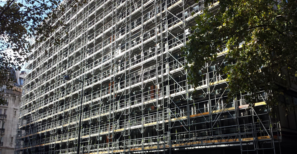 Certyfikowane rusztowania elewacyjne z profili zamkniętych (słupki, rygle i stężenia) umożliwiające niezwykle szybki montaż dzięki rozetom BRIO.