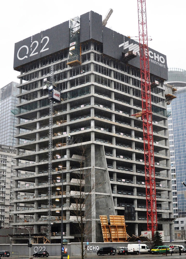 W centrum Warszawy powstaje jeden z najwyższych budynków w Polsce - biurowiec Q22. Będzie się on składał z 47 kondygnacji (45 nadziemnych i 5 podziemnych) o łącznej powierzchni użytkowej 50 tys. m².