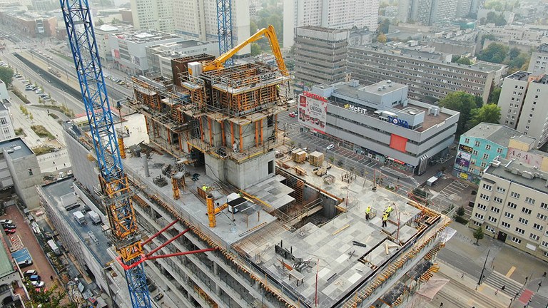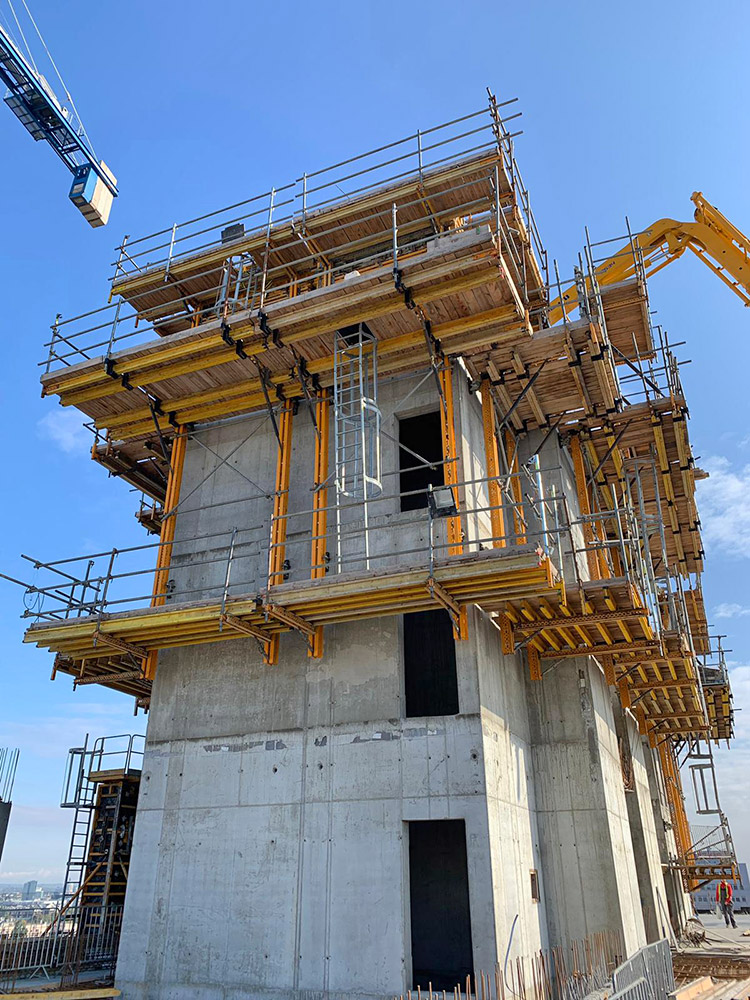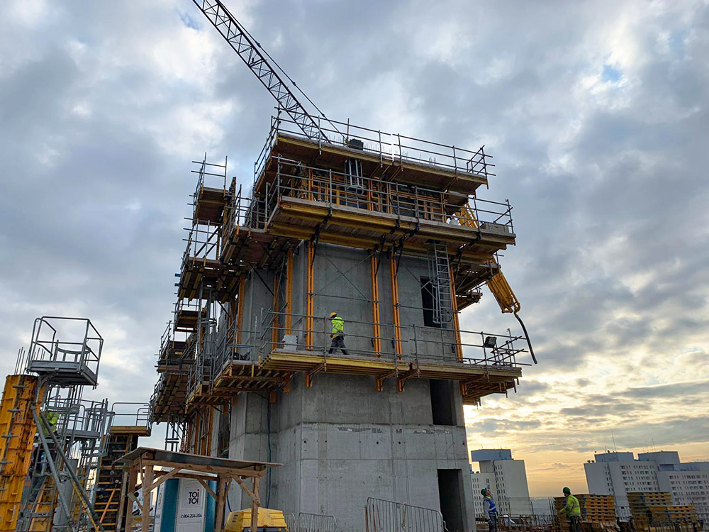 Obecnie trwają prace nad budową najwyższego biurowca, liczącego 20 kondygnacji nadziemnych oraz 2 podziemne. Trzon budynku wykonywany jest z wyprzedzeniem za pomocą systemu samowznoszącego RKS, który pozwala na bezpieczne wznoszenie na dużych wysokościach bez użycia żurawia. Poszczególne segmenty deskowania są przestawiane na kolejne etapy przy użyciu mobilnego układu hydraulicznego. W celu sprawnego przestawiania segmentów, ULMA dostarczyła na budowę dwa komplety siłowników z pompą. Uzupełnienie systemu RKS wewnątrz trzonów stanowią pomosty zapadkowe KSP.
