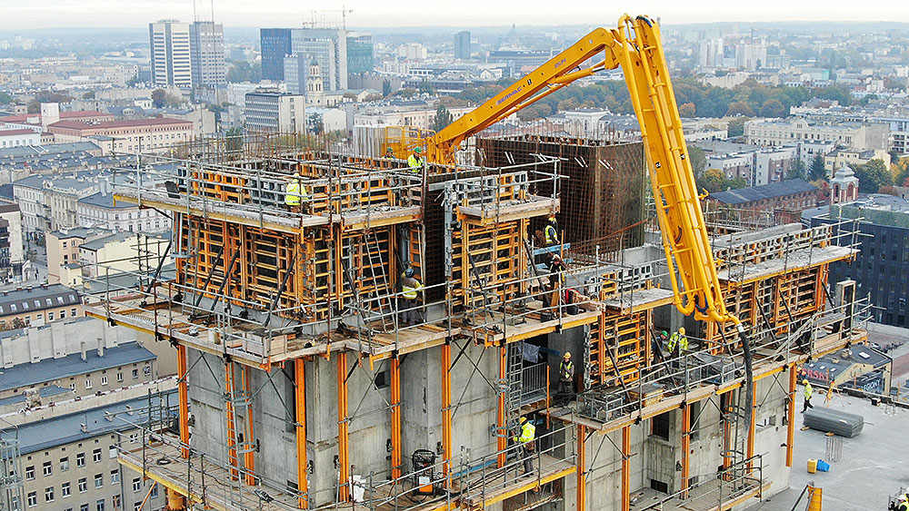 Do realizacji ścian żelbetowych trzonu wykorzystano deskowanie ścienne ORMA, zaprojektowane na maksymalne parcie betonu do 80 kN/m². Odpowiednie tempo prac podczas wykonywania stropów zapewnił system panelowy CC-4 z głowicą opadową, która umożliwia wcześniejsze odzyskanie części nośnej deskowania.