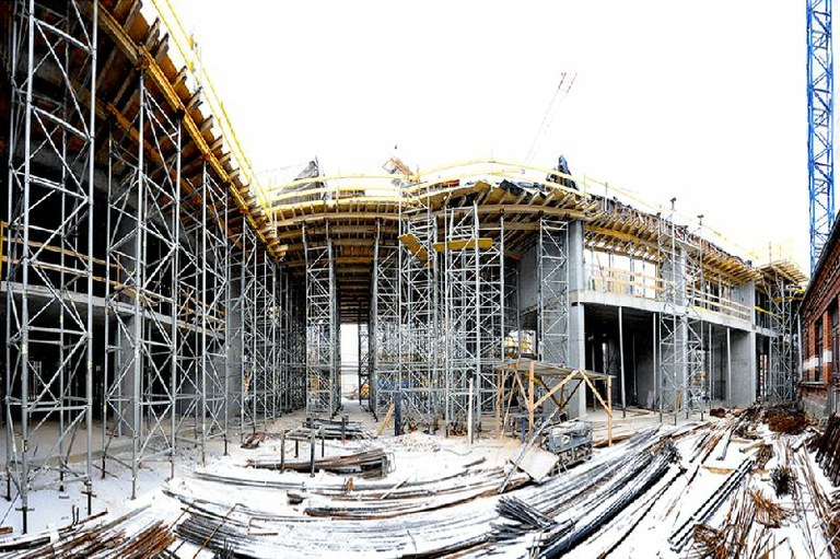 Podczas budowy wykorzystane zostały typowe dla budynków kubaturowych systemy: ścienny PRIMO oraz stropowy ENKOFLEX. W związku z wysokimi przejazdami i półpiętrami w budynku zaistniała konieczność użycia wież T60 o wysokości sięgającej 9 m. Zastosowanie znalazły również pomosty KSP oraz krótkie wsporniki MK.
