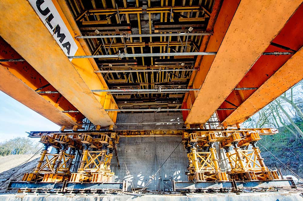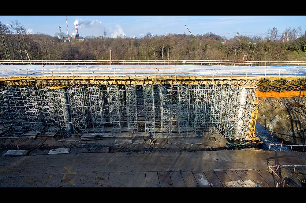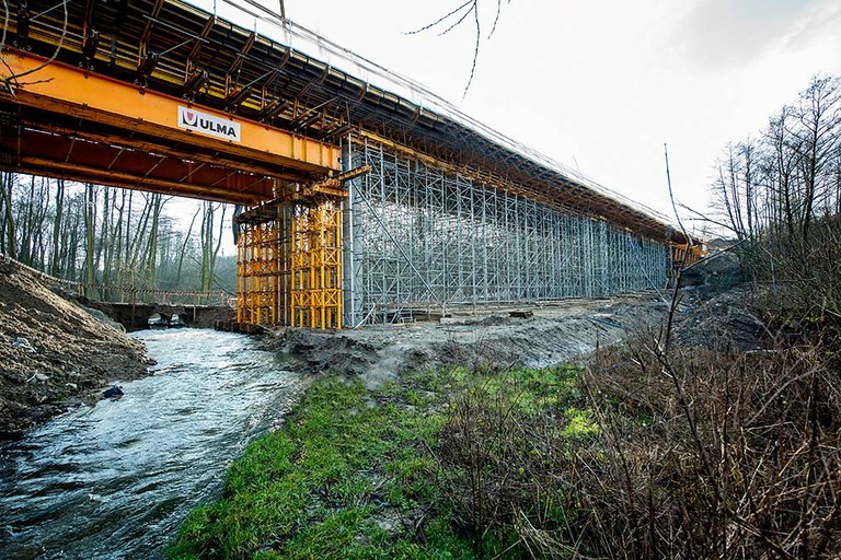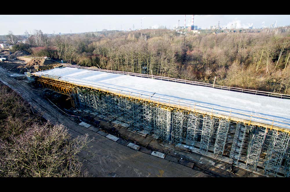 Realizacja tej inwestycji wymagała opracowania specjalnych rozwiązań z uwagi na trudne warunki terenowe oraz małą odległość między fundamentem a spodem ustroju. Do budowy tego 4-przęsłowego obiektu firma ULMA zaproponowała rozwiązania z użyciem blachownic TAC-1200 o rozpiętości 21 m (w przęśle 1-2) oraz kratownic MK o rozpiętości 20,63 m podpartych na wieżach MK (przęsło 4- 5). W przęsłach 2-3 i 3-4 deskowanie ustroju nośnego oparte jest bezpośrednio na wieżach T-60. Do realizacji ustroju nośnego wykorzystano rygle stalowe MK oraz belki drewniane VM.