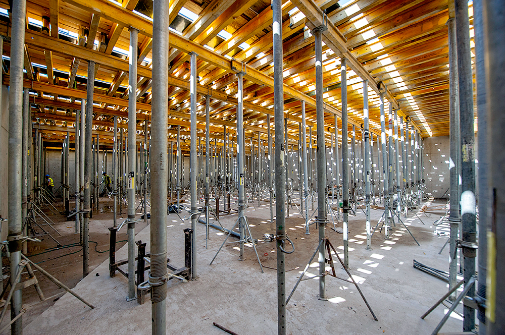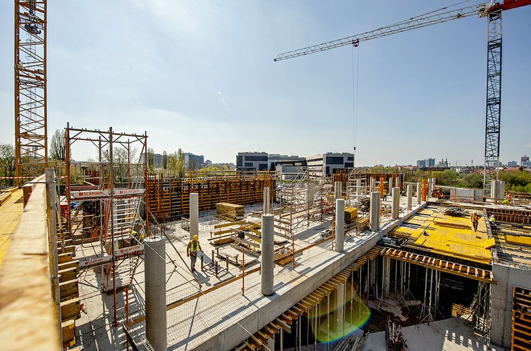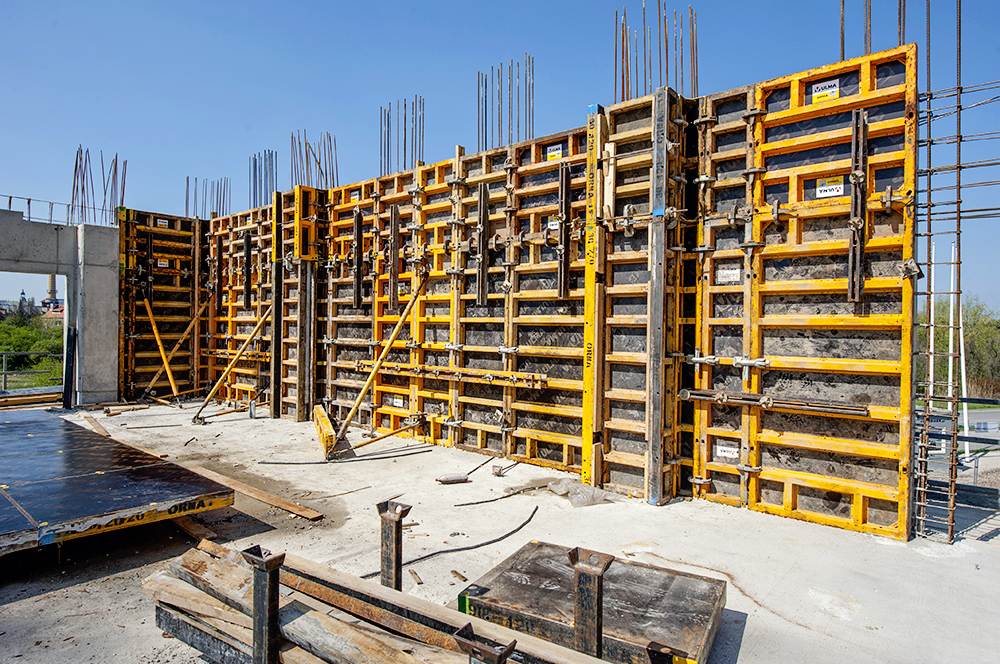 Kluczowym zagadnieniem do rozwiązania były ściany żelbetowe, które od strony wewnętrznej nie będą tynkowane dlatego niezwykle ważne jest użycie systemu deskowań, który gwarantuje doskonałą jakość powierzchni betonu. Do tego zadania doskonale nadaje się system deskowań ściennych ORMA. Do wykonania stropów wykorzystano system Enkoflex. Ponadto na każdej kondygnacji zaprojektowano ok. 90 słupów kołowych o średnicy od 50 do 60 cm. Są to elementy, które również nie będą w przyszłości tynkowane, dlatego wymagania dotyczące jakości deskowań były bardzo wysokie. W przypadku słupów zastosowano system deskowania TUBUS oraz CLR.