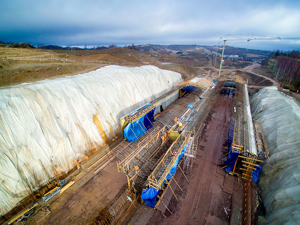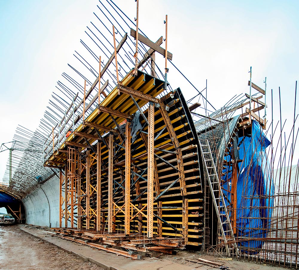 ULMA Construccion Polska dostarczyła kompleksowe rozwiązania z zakresu deskowań, które wykorzystane były w pierwszej kolejności do budowy fundamentów ścian. Podczas tego zadania idealnie sprawdził się nasz uniwersalny system ścienny ORMA. Następnie wykonano ściany tunelu. Tutaj z kolei zaprojektowano indywidualne rozwiązanie na bazie systemu MK, które pozwoliło na realizację ściany o długości 12,5 m. Konstrukcja deskowania ścian została wyposażona dodatkowo w zespoły ślizgu oraz rolki, które pozwalają na sprawne rozdeskowanie oraz przetoczenie deskowania na kolejny segment bez potrzeby użycia dźwigu. Natomiast do betonowania kaloty tunelu ULMA przygotowała kompletny projekt wózka, który został wykonany w systemie MK z elementami systemu TMK. Jego główną konstrukcję stanowi rama z rygli MK, blach i węzłów TMK oraz elementów specjalnych TMK w rozstawie co 1,5 m.