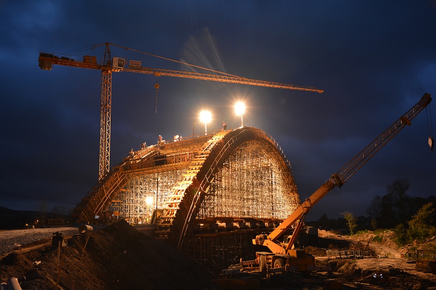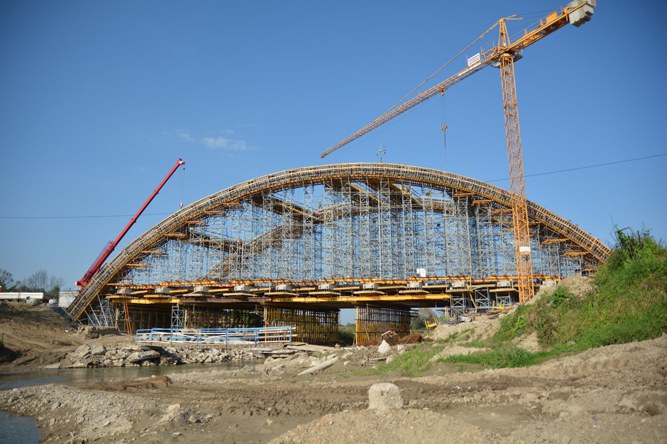 Do realizacji skrajnych podpór użyto głównie blatów deskowania ramowego PRIMO. Konstrukcję nośną deskowania poprzecznic stanowi ruszt stalowo-drewniany z dźwigarów VM 20 oraz rygli DSD, połączonych ze sobą łącznikami systemowymi DSD. W skrajnych osiach mostu podparcie rusztu pod płytą stanowią wieże T-60 o module 1 x 1,5 m. W przęsłach centralnych, tj. od 1. do 5. osi, podparcie stanowi ruszt z profili stalowych na podporach wysokonośnych S-40. Do wykonania poprzecznic użyto systemów deskowań ramowych PRIMO i NEVI. Deskowanie płyty pomostu, podobnie jak szalunek poprzecznic, zostało usytuowane na ruszcie stalowo-drewnianym z dźwigarów i rygli. Do podparcia rusztu w sektorach skrajnych obiektu również użyto wież T-60 o 2 modułach wymiarowych 1 x 1,5 m oraz 1,5 x 1,5 m. Natomiast w części centralnej podparcie rusztu pod płytą zaprojektowano w postaci pasów z rygli MK połączonych ze sobą na długości złączami 90 MK. Deskowanie łuków oraz wiatrownic zaprojektowano jako ruszt stalowo-drewniany z obustronnymi pomostami roboczymi. Konstrukcję nośną rusztu stanowią krążyny stalowe z rygli MK, podpór pionujących E oraz łączników systemowych MK uformowanych w kształcie łuku. W części centralnej łuku zastosowano ruszt prosty z dopasowaniem do jego geometrii poprzez odpowiedni wysuw trzpieni wież podporowych. Ruszt górny wykonano z dźwigarów VM 20 (podsklejkowych) w rozstawie co 25 cm. Dla uzyskania żądanego promienia łuku, do dźwigarów zostały przybite drewniane listwy formujące krzywiznę sklejki. Deskowanie boczne łuku i wiatrownic zrealizowano przy użyciu systemu ramowego PRIMO i NEVI. Zamknięcie deskowania od góry na odcinkach łuków o dużej pochyłości zostało wykonane ze sklejki i kantówek mocowanych do rygli, zapiętych do płyt szalunkowych ściągami czołowymi oraz kotwionymi do rusztu ściągami DW15. Podparcie deskowania zrealizowano przy użyciu wież podporowych T-60 o modułach wymiarowych 1 x 1 m oraz 1 x 1,5 m. Wieże pod łukami ustawione są w osi, na wymianach z rygli MK od poziomu belek oczepowych HEB 320 ułożonych na poprzecznicach. Wieże pod wiatrownicami ustawione są natomiast bezpośrednio z poziomu płyty pomostu. W miejscach połączenia wiatrownic z łukami zastosowano dodatkowe podparcie z podpór ALUPROP pod ryglami ułożonymi na wspornikach T-60 od strony wewnętrznej łuku.