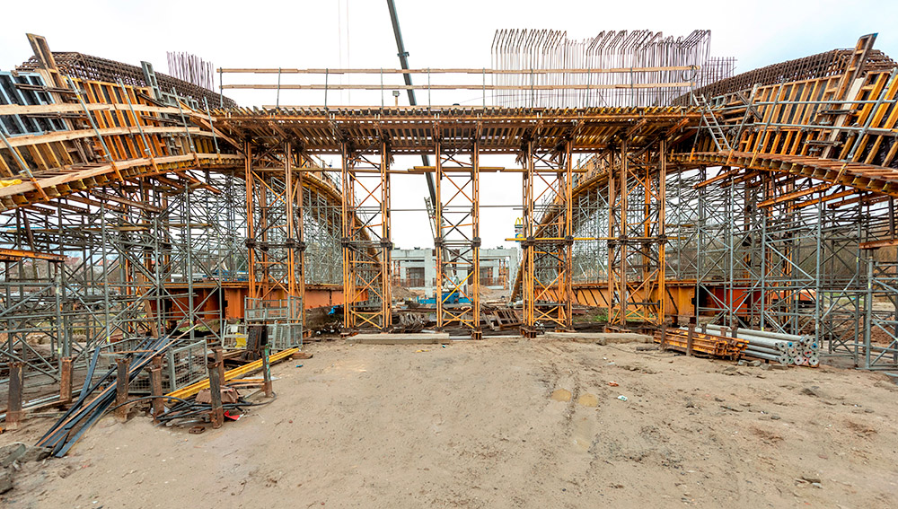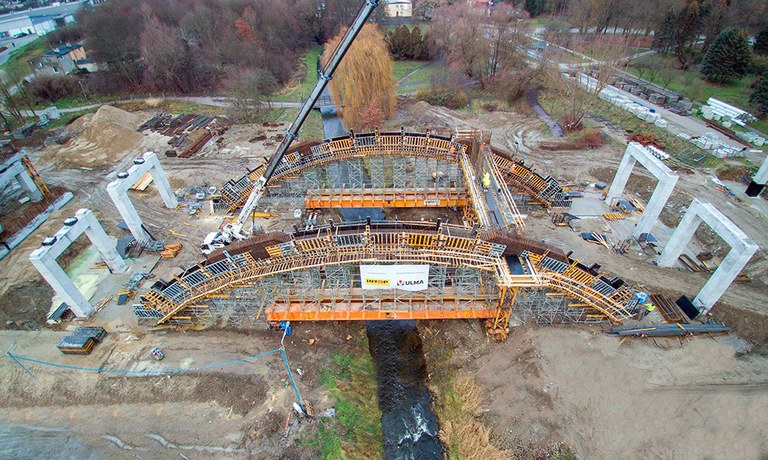 Do realizacji przyczółków oraz filarów posłużył system ramowy ORMA. Doskonale sprawdził się on również podczas konstrukcji łuków żelbetowych. Do podparcia deskowania oczepów filarów oraz łuków wykorzystano wieże T-60, natomiast wieże MK sprawdziły się idealnie do podparcia deskowania poprzecznic w przęśle nurtowym, gdzie zostały posadowione na dwóch blachownicach TAC o długości 24 m, złączonych w tandem. Blachownice TAC z zamontowanym systemem hydraulicznym oparto na konstrukcji wsporczej. Osiem siłowników hydraulicznych umożliwiło opuszczenie deskowania po zabetonowaniu łuków żelbetowych.