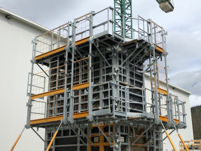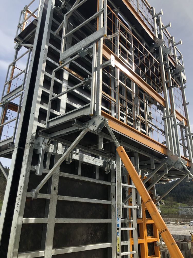 Obarierowanie podestów wykonano z siatek a komunikacja pionowa pomiędzy podestami realizowana jest za pomocą drabin F4, po których pracownik porusza się tyłem do deskowania. Możliwe jest także wykonanie dodatkowego zabezpieczenia dla pracownika poruszającego się pomiędzy poziomami. Oprócz standardowego zabezpieczenia montowanego na drabinie, zaprojektowano elementy do zamknięcia przestrzeni pomiędzy podestami za pomocą siatek, co pozwala na zabezpieczenie pracownika przed upadkiem w początkowej fazie, gdy znajduje się nad obarierowaniem pomostu. Ponadto podest najwyższego poziomu można wyposażyć dodatkowo w obarierowanie szczytowe, które gwarantuje bezpieczeństwo pracownika podczas betonowania lub demontażu zawiesi transportowych.