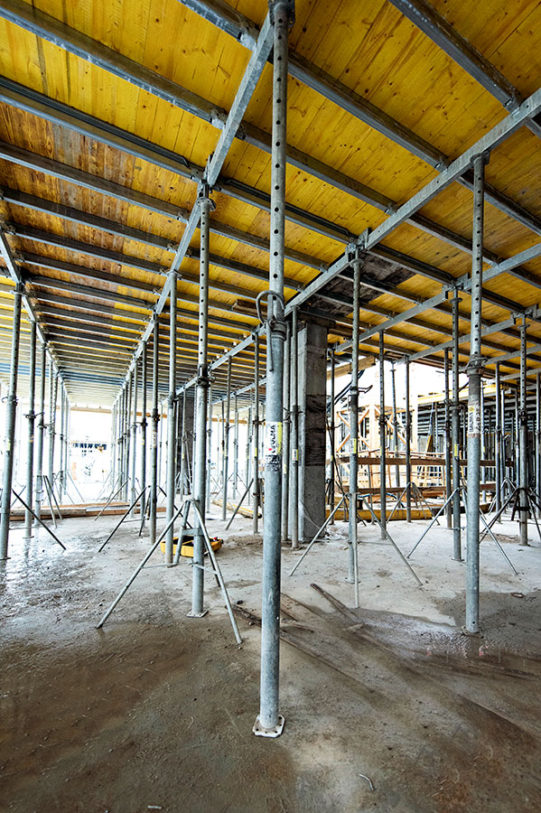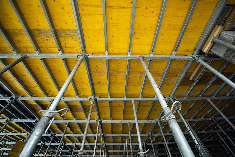 Szybsza wykonywanie prac szalunkowych nie zawsze musi stać w konflikcie z odpowiednim poziomem bezpieczeństwa. System doceniany jest za możliwość montażu całej konstrukcji nośnej z poziomu stropu, na którym jest ustawiany. W czasie montażu elementy są wstępnie zawieszane na belkach głównych deskowania, a następnie podnoszone i układane w docelowym miejscu za pomocą specjalnych wideł. Podczas rozszalunku, w momencie opuszczania głowic, wszystkie elementy deskowania oraz płyty drewniane poszycia zabezpieczone są przed upadkiem z wysokości. Cała konstrukcja pozostaje stabilna i stanowi zabezpieczenie dla poszycia, które zdejmowane jest w następnym kroku. Nadmienię, że na budowach zauważono mniejsze zużycie poszycia i mniejszą ilość zniszczonych płyt drewnianych.