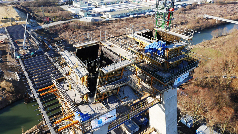 Firma ULMA Construccion S.A. jest dostawcą systemu deskowań na tę budowę. Do realizacji nóg pylonu wykorzystano kompletny system samowznoszący ATR.