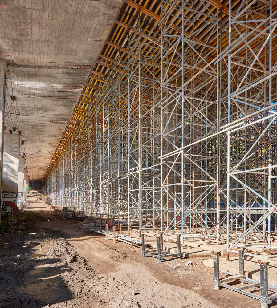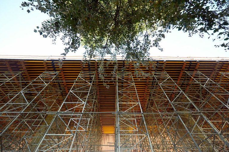 Z uwagi na ograniczone możliwości przestrzenne, dostawy materiału i sam projekt deskowania dostosowano do podziałów konstrukcji w taki sposób, aby poszczególne segmenty wykonać jak najmniejszą ilością sprzętu, przestawiając szalunek z sekcji na sekcję. Po zabetonowaniu płyty ruszty deskowania są podwieszane do ustroju poprzez elementy kotwiące a wieże w całości przestawiane na kolejne przęsła, analogicznie gotowe blaty z powrotem wracają na ustawione wieże.