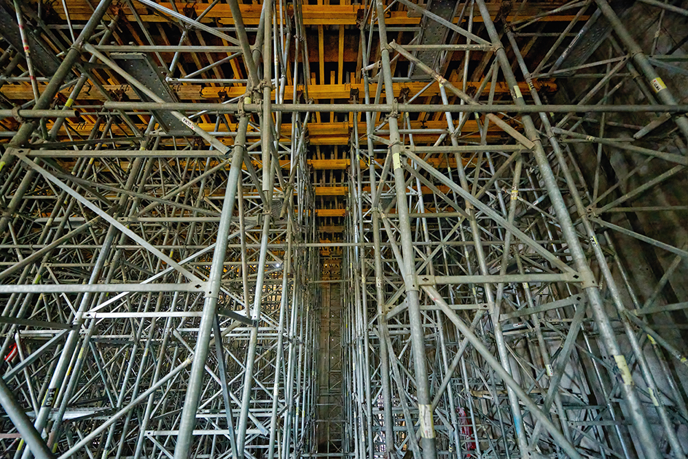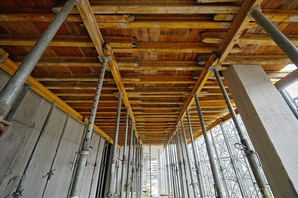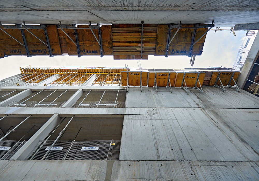 Do realizacji ścian, słupów i belek wykorzystano system ścienny ORMA. Do podparcia stropów auli posłużyły wieże T-60. Z uwagi na ich elastyczność i możliwość dopasowania do różnej geometrii doskonale sprawdziły się podczas budowy wysokich ścian auli, które wykonywane były jednoetapowo. Rusztowanie BRIO zapewniło swobodną komunikację podczas prac budowlanych. Stropy zostały wykonane za pomocą systemu ENKOFLEX. Do realizacji wysokich słupów posłużył system ORMA i TUBUS.