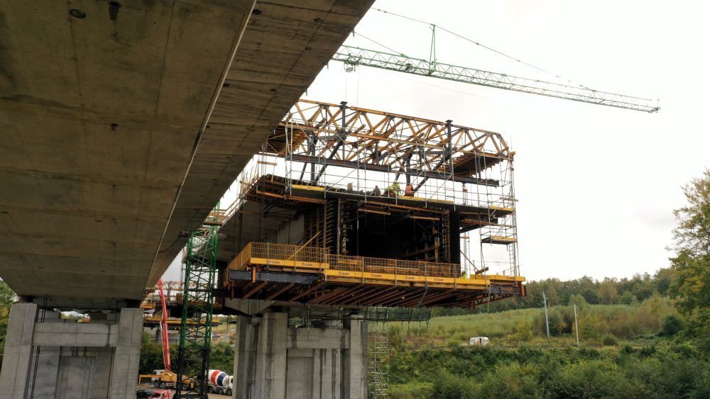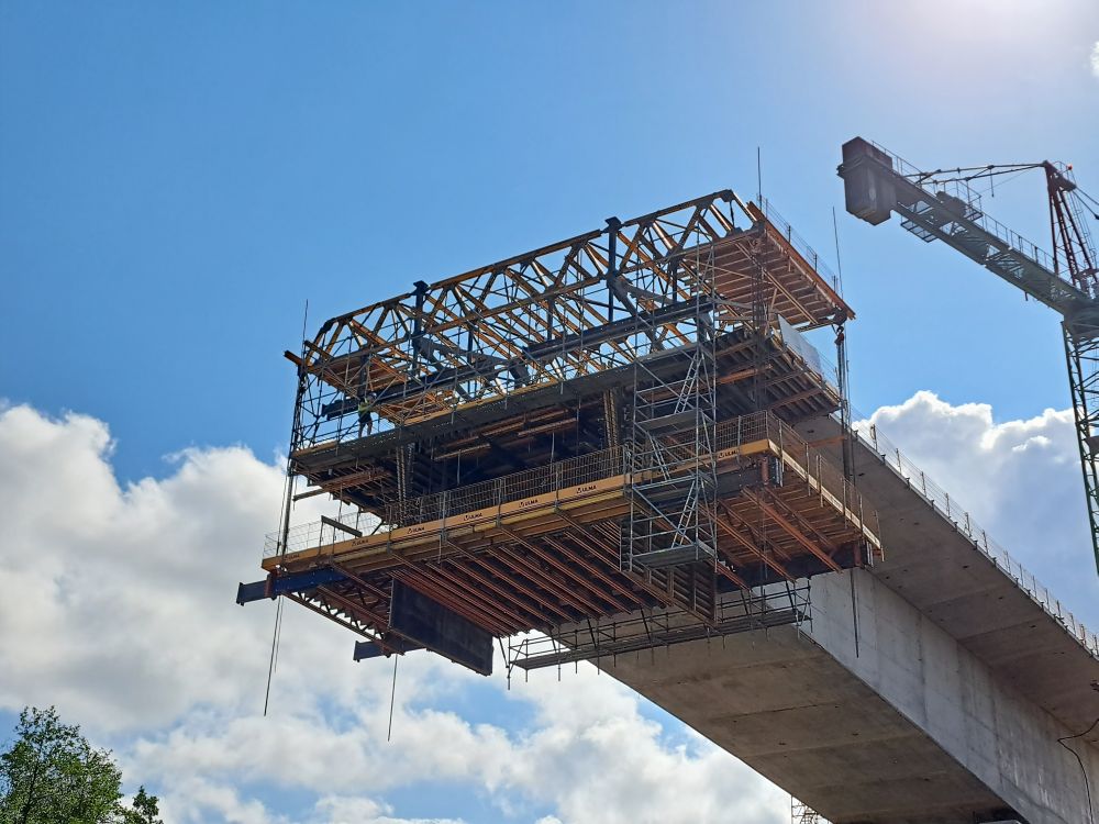 Ustrój nośny w części realizowanej metodą nawisową powstaje z wykorzystaniem wózków CVS, które wyróżnia duża nośność i możliwość wykonywania ustrojów o zróżnicowanym przekroju. Na budowie jednocześnie pracuje aż 8 wózków nawisowych ULMA, które zaprojektowano do realizacji segmentów o długościach z zakresu od 4 m do 5 m. Utrzymanie 7-dniowego cyklu prac oraz wysokiego poziomu bezpieczeństwa podczas obsługi wózków umożliwiły trzy układy hydrauliczne.