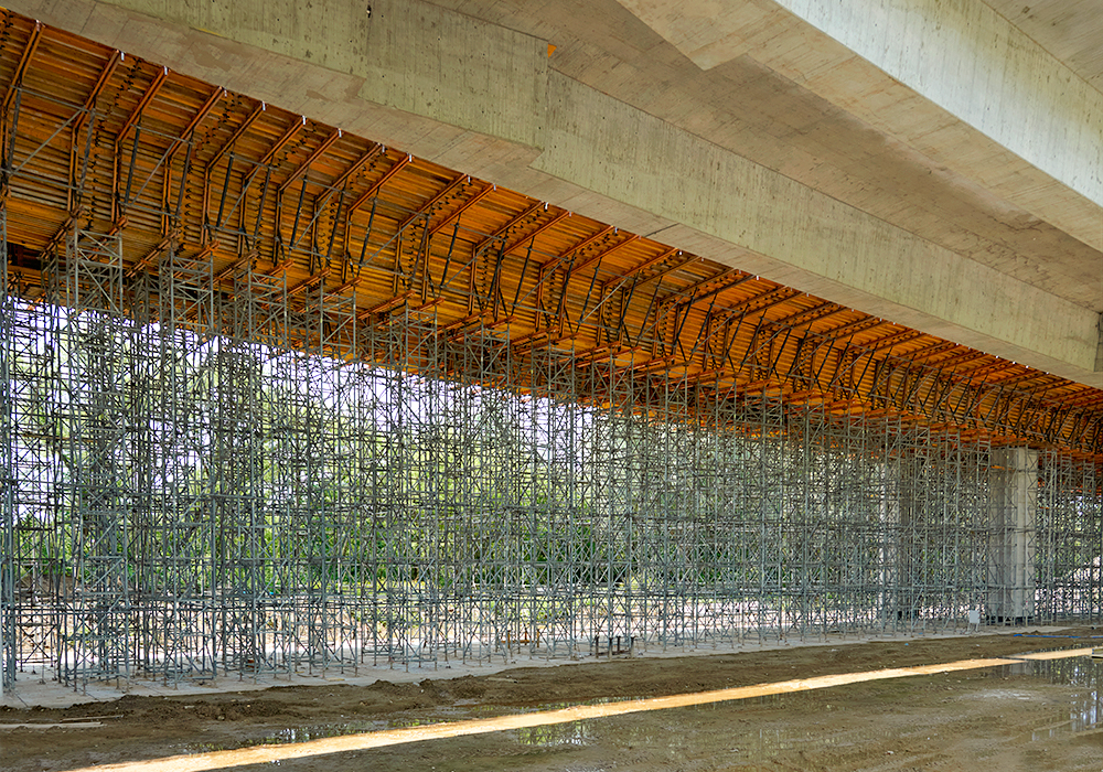 Rozwiązania do realizacji tego obiektu dostarcza firma ULMA. Deskowanie zaprojektowano z elementów uniwersalnego systemu ENKOFORM HMK. Podstawowe grupy elementów systemu to: dźwigarki VM20, rygle stalowe 12 cm z profili 2x C120, łączniki stalowe, sklejka szalunkowa 21mm. Jego uzupełnieniem są akcesoria służące do łączenia w pionie i poziomie oraz elementy BHP (uchwyty, słupki i poręcze). Konstrukcja deskowania ustroju nośnego zaprojektowana została jako scalone sekcje koryt zbudowane na bazie krążyn stalowych dopasowanych do geometrii estakady.