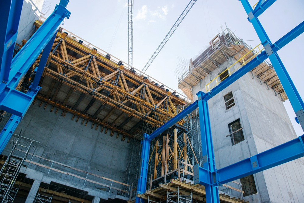 Oprócz standardowych zabezpieczeń i słupków bezpieczeństwa na budowie zastosowano m.in schodnię o wysokości 40 m, wykonaną w systemie rusztowań modułowych BRIO, która zapewniła komunikację pionową, a także przejezdne rusztowania do robót ciesielskich i zbrojarskich. Część rusztowań zbrojarskich została umieszczona na pomostach BMK.