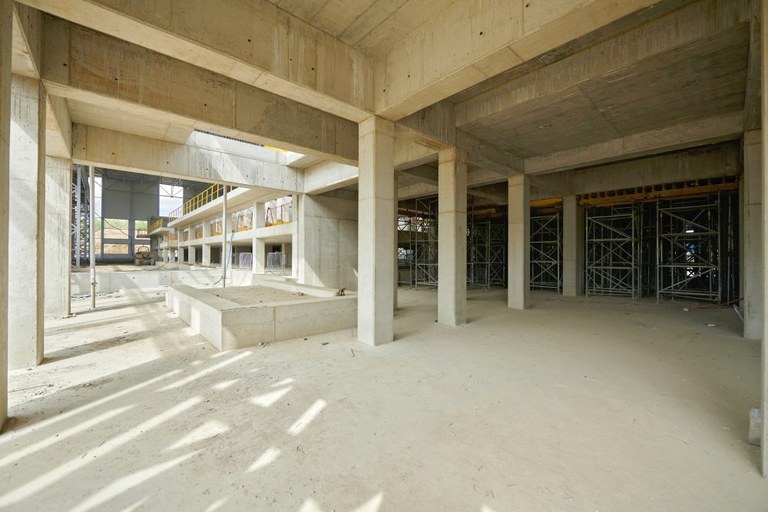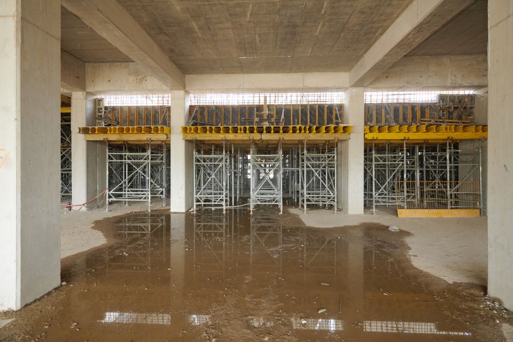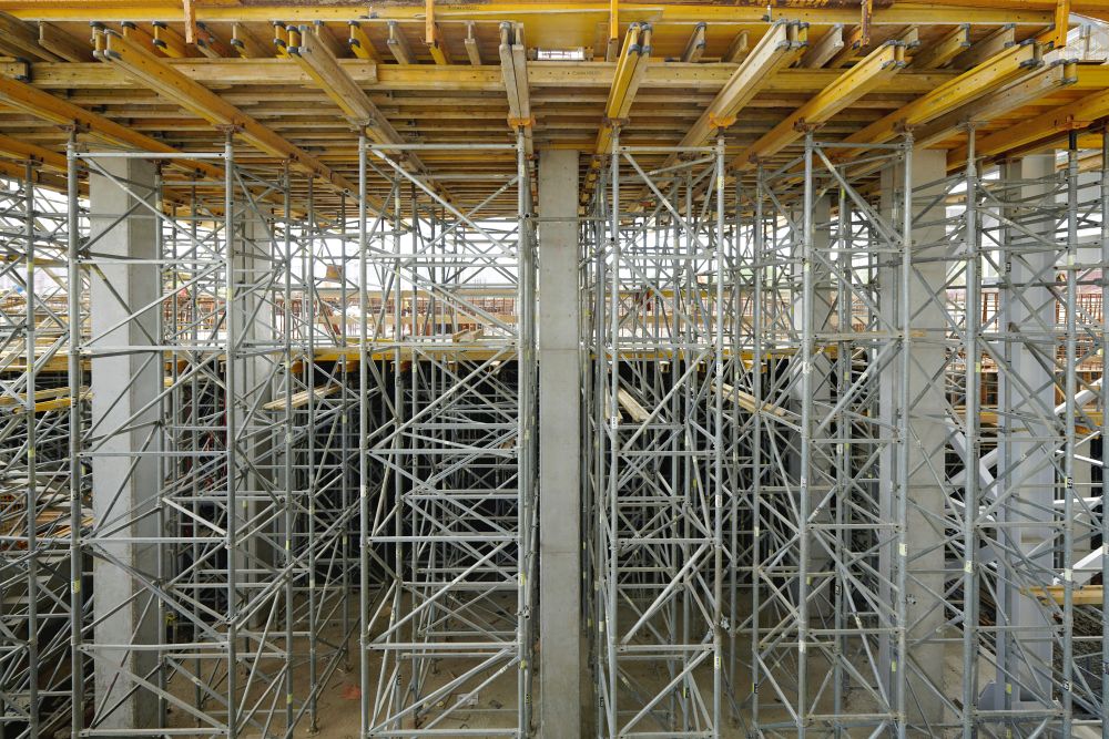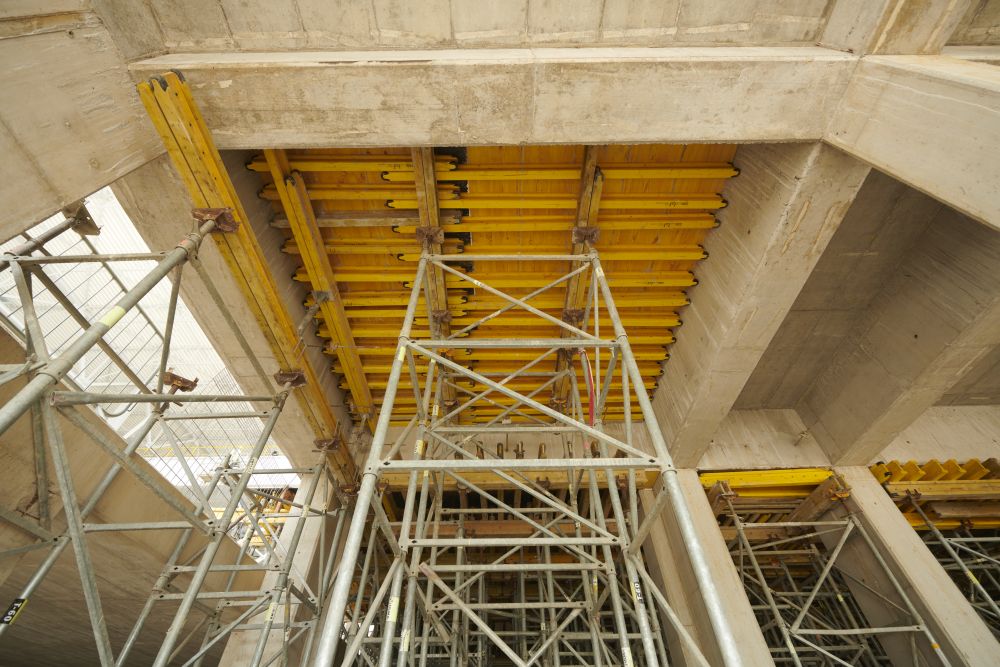 Płyty fundamentowe, stopy i ściany wykonano przy użyciu systemów ściennych PRIMO, ORMA i COMAIN. W szczytowym momencie prac na budowie rotowało ponad 3000 m² deskowania ściennego. Słupy podpierające masywne stropy zaprojektowano w systemie płyt wielootworowych ORMA, których dostarczono łącznie ponad 100 sztuk. Podparcie stropów wykonano z użyciem wież T-60, podpór ALUPROP, rygli stalowych systemu MK, DSD oraz belek drewnianych VM.