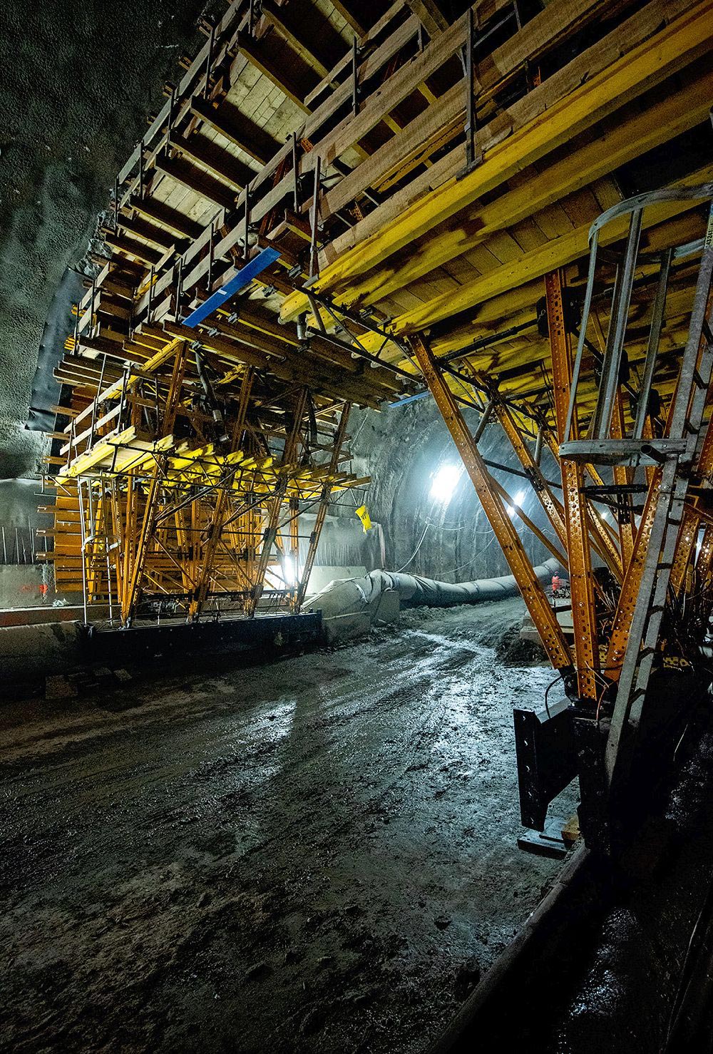 Do realizacji obudowy stałej tunelu firma ULMA zaprojektowała wózek wykonany w systemie MK z elementami systemu TMK. Projekt wymagał dopasowania do złożonej geometrii tunelu, szczególnie w zakresie gzymsu pod płytę stropową. Zaproponowane rozwiązanie stanowiła specjalna blacha gzymsu, która pozwoliła na przeniesienie obciążeń od betonowania oraz szybkie rozdeskowanie. Wykorzystane zostały także gotowe blachy poszycia, które zapewniły wysoką jakość powierzchni betonu. Wózek wyposażony jest w układ hydrauliczny, który umożliwia odspajanie skrzydeł, poziomowanie wózka i jego przejazd.