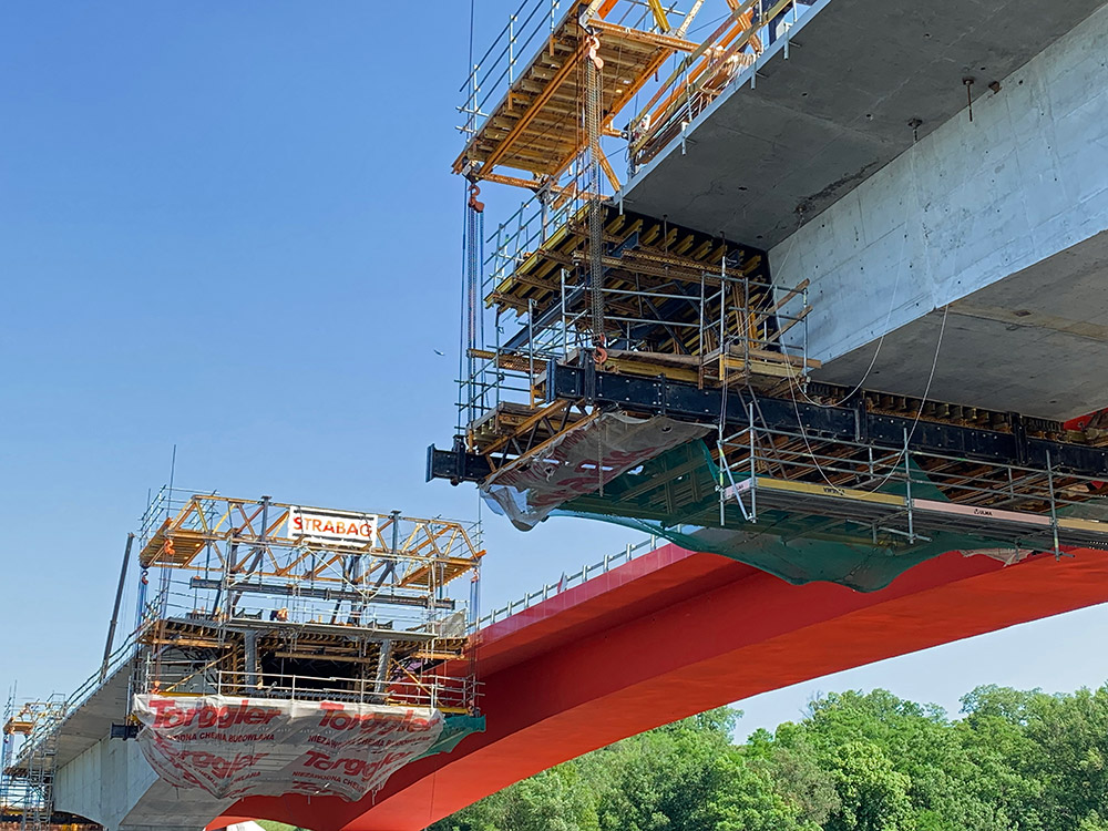Do realizacji elementów startowych wykorzystano system Enkoform HMK, które zostało podparte na wieżach T-60. Podczas budowy przęseł nurtowych doskonale sprawdziły się 4 wózki nawisowe CVS, które umożliwiają wykonywanie segmentów o ciężarze do 300 ton. Segmenty, o długości 4,45 metrów były realizowane w cyklach 7-dniowych. Wózki zbudowane są z elementów niezwykle uniwersalnego systemu MK, dzięki czemu możliwe jest dopasowanie ich konstrukcji do dowolnej geometrii obiektu. Wszystkie wózki zostały wyposażone w systemowe podesty robocze zbudowane z elementów systemu BRIO.